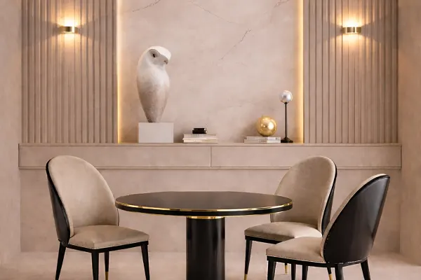 ← Collections · ONIX · Art déco réinventé. Luxe intemporel. Ensemble canapé et fauteuil, daim nacré Agrandir × Table ronde et chaises, 90 cm, daim nacré Agrandir × ‹ › Canapé deux places, daim nacré Agrandir × Fauteuil, daim nacré Agrandir × Canapé et fauteuil d’attente, restaurant Parisienne Agrandir × Demander un devis